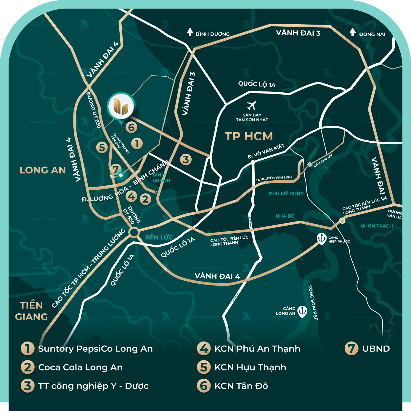 Trong bán kính 5-10km là hàng loạt các khu công nghiệp lớn: KCN Prodezi (400ha), KCN Phú An Thạnh (hơn 1.000ha), KCN Hựu Thạnh (hơn 500ha), KCN Tân Đô (303ha), trung tâm công nghiệp Y - Dược (338ha),... tập trung hàng trăm ngàn lao động, chuyên gia làm việc tại đây.