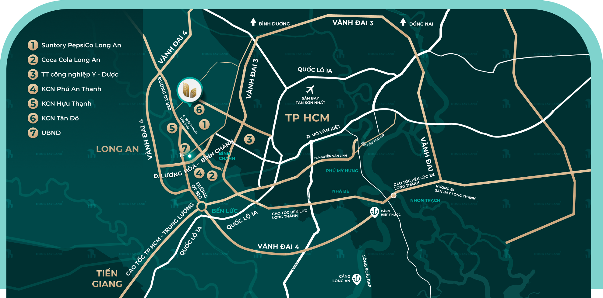 Trong bán kính 5-10km là hàng loạt các khu công nghiệp lớn: KCN Prodezi (400ha), KCN Phú An Thạnh (hơn 1.000ha), KCN Hựu Thạnh (hơn 500ha), KCN Tân Đô (303ha), trung tâm công nghiệp Y - Dược (338ha),... tập trung hàng trăm ngàn lao động, chuyên gia làm việc tại đây.